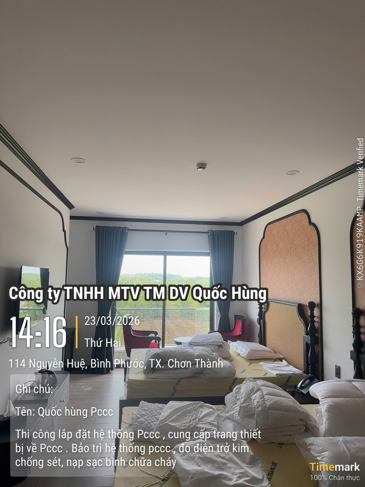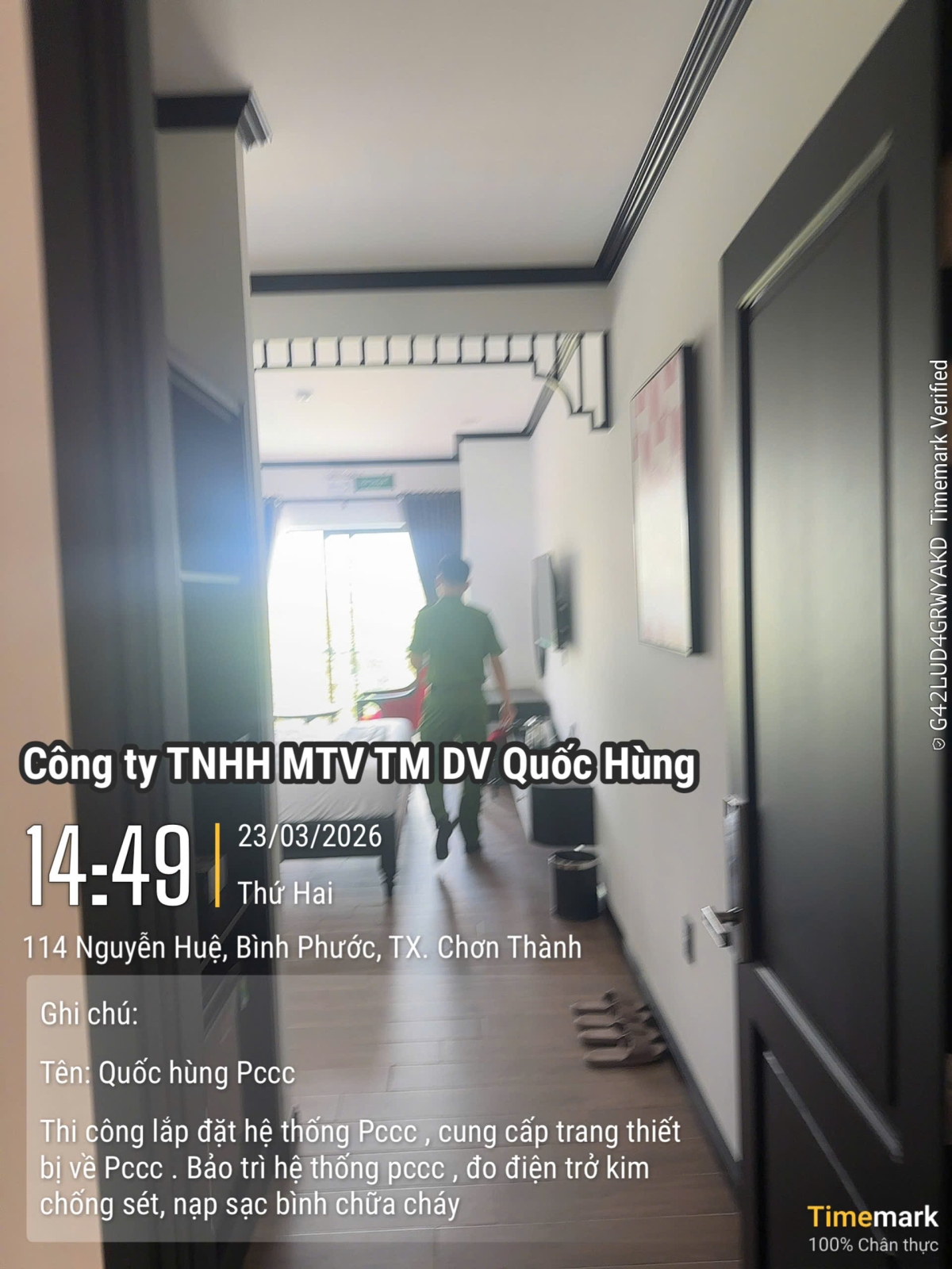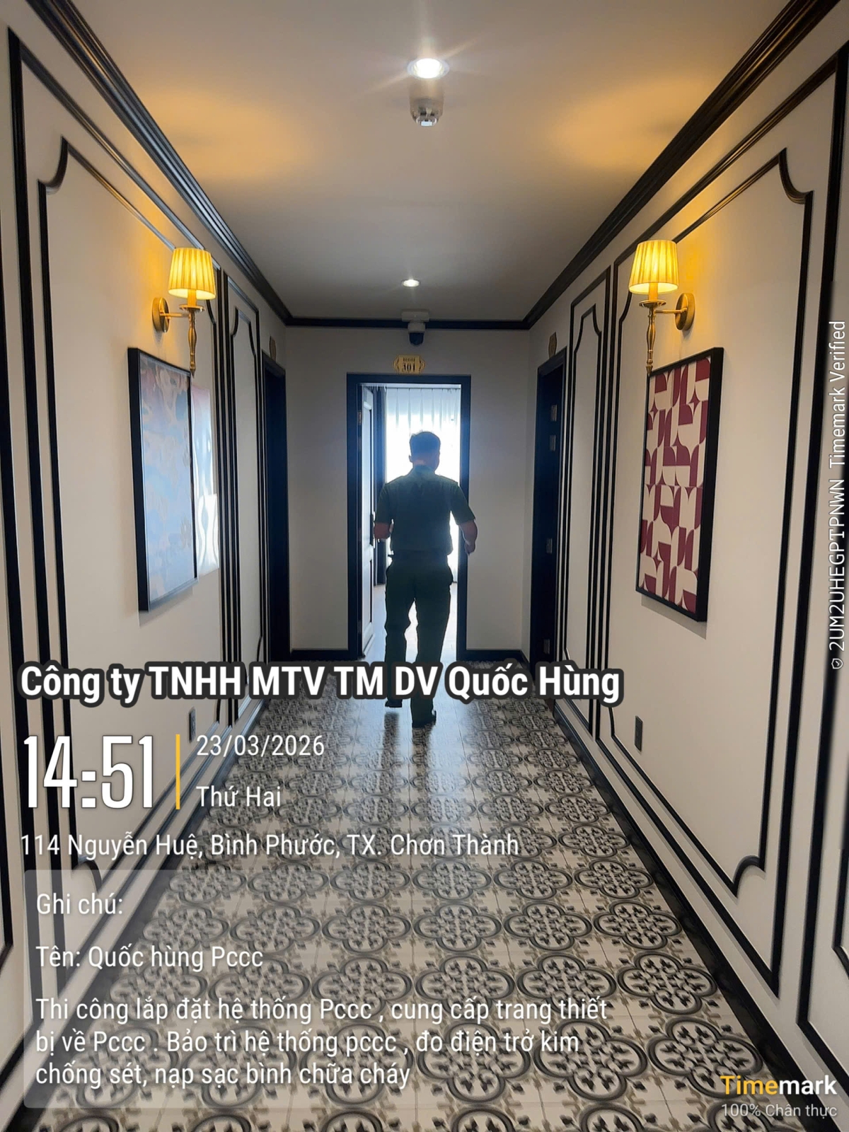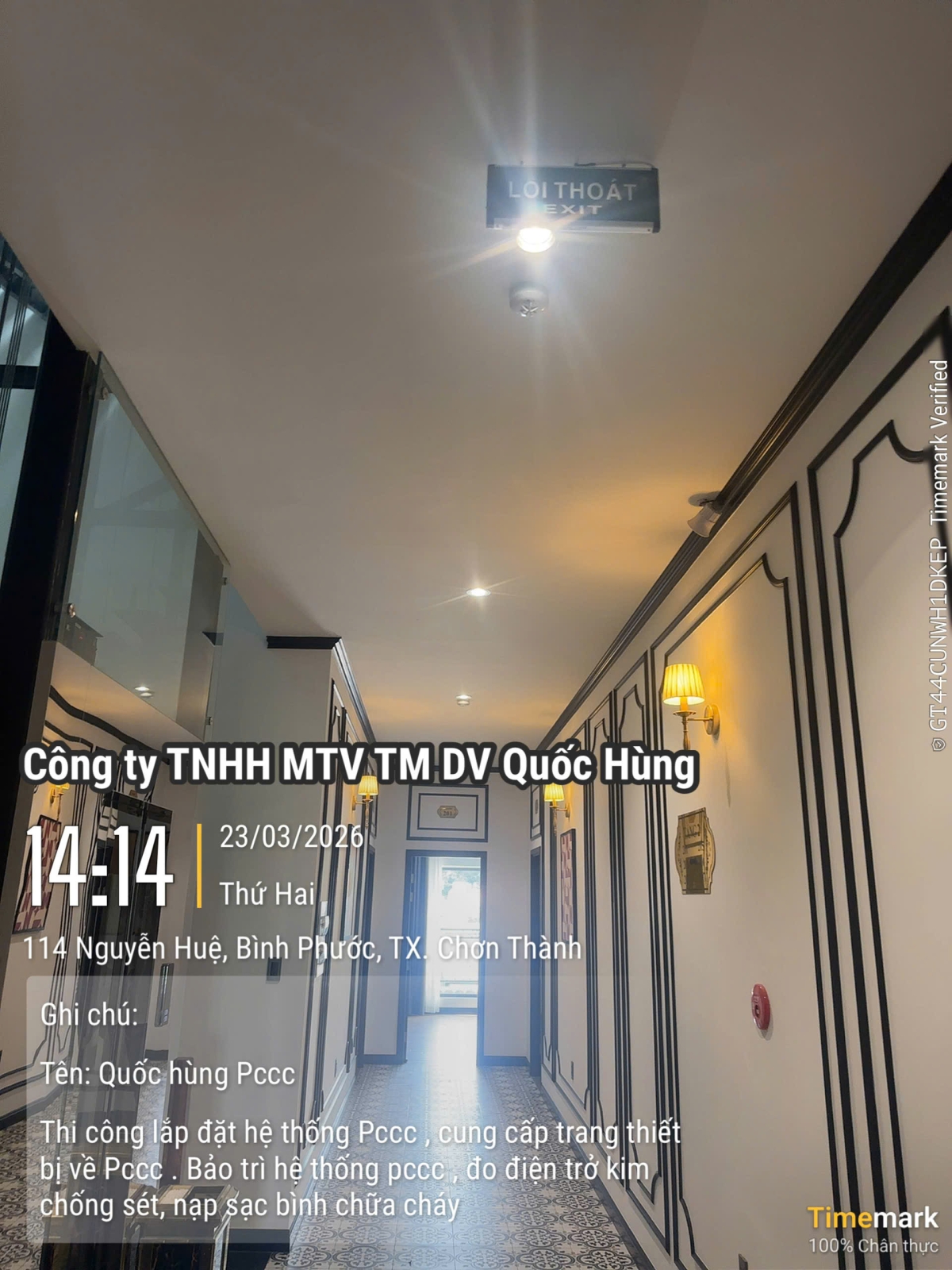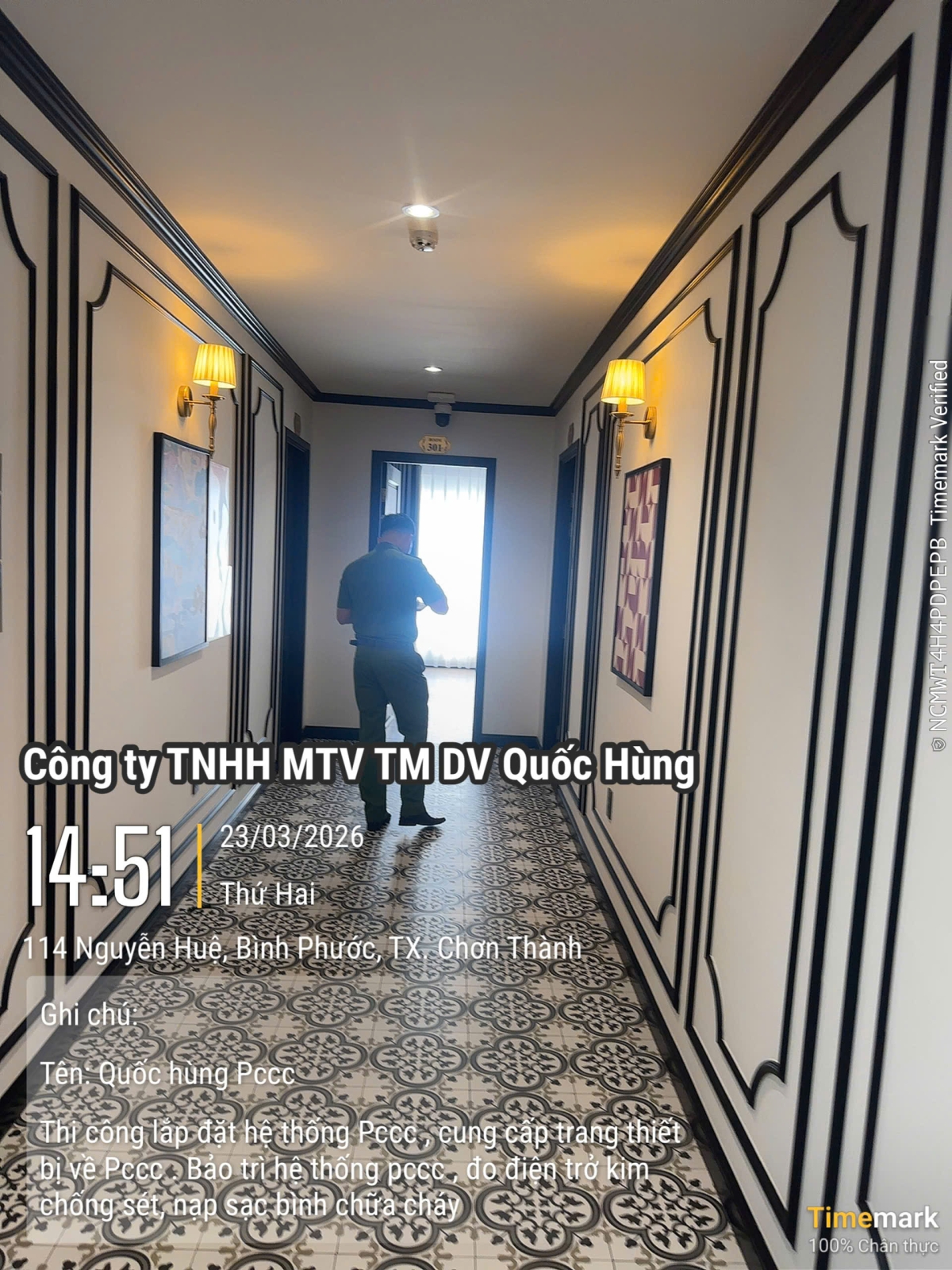 CÔNG TY TNHH MỘT THÀNH VIÊN THƯƠNG MẠI DỊCH VỤ QUỐC HÙNG đã hoàn tất thi công, lắp đặt và nghiệm thu hệ thống phòng cháy chữa cháy (PCCC) tại Trọng Phát Hotel – Chơn Thành, Bình Phước, đảm bảo đúng tiêu chuẩn kỹ thuật và quy định pháp luật hiện hành.